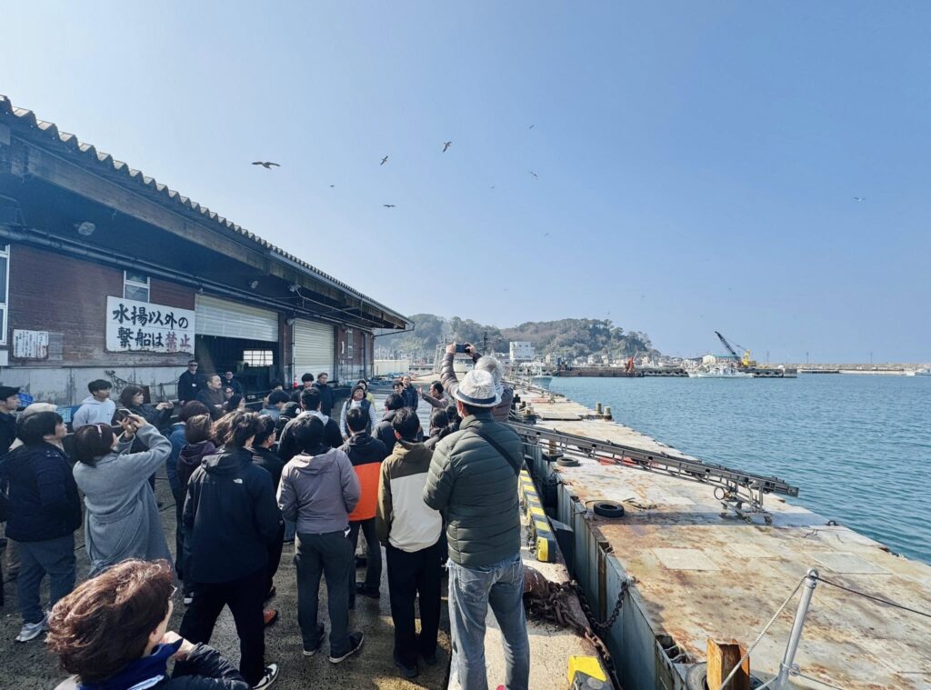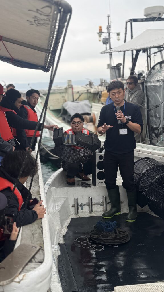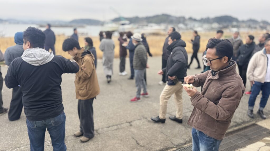 そして能登3日目はオプショナルツアーで、能登の漁場めぐりへ。まず七尾の石崎漁港で、震災後、七尾牡蠣の養殖に取り組む竹内さん達の取り組みを見学しました。
